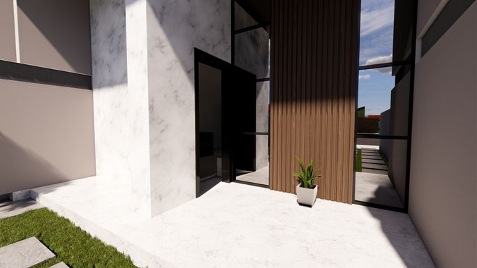 - Porta de entrada lambril de alumínio preto com puxador em inox;